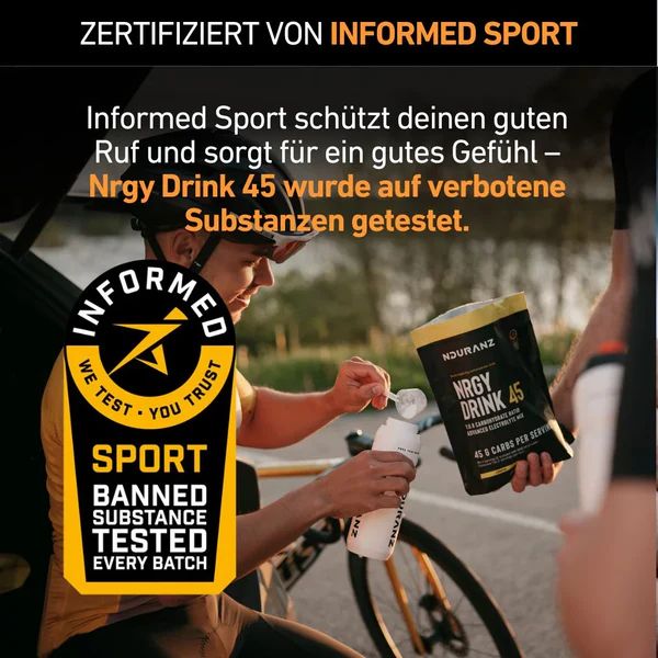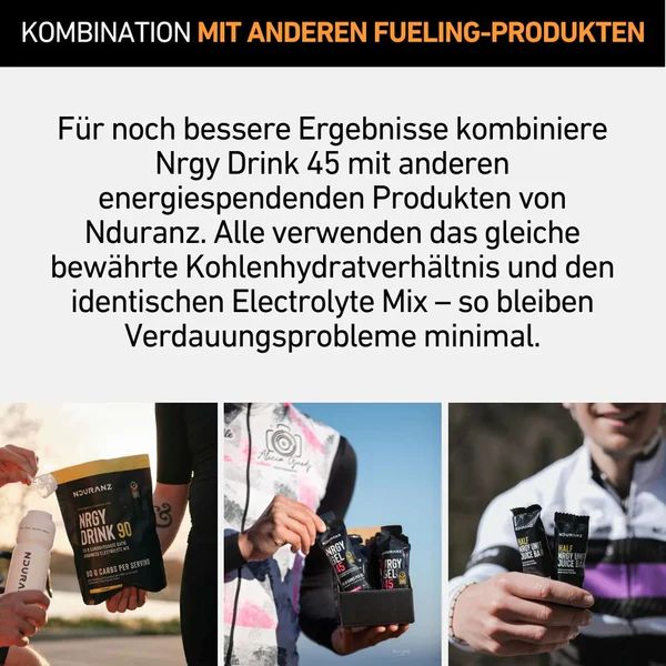 Pro-Tipp: Kombiniere den Drink mit anderen Nduranz Produkten. Da alle auf demselben 1:0,8 Verhältnis basieren, bleibt dein Magen auch bei einem Mix aus Gels und Getränken ruhig.