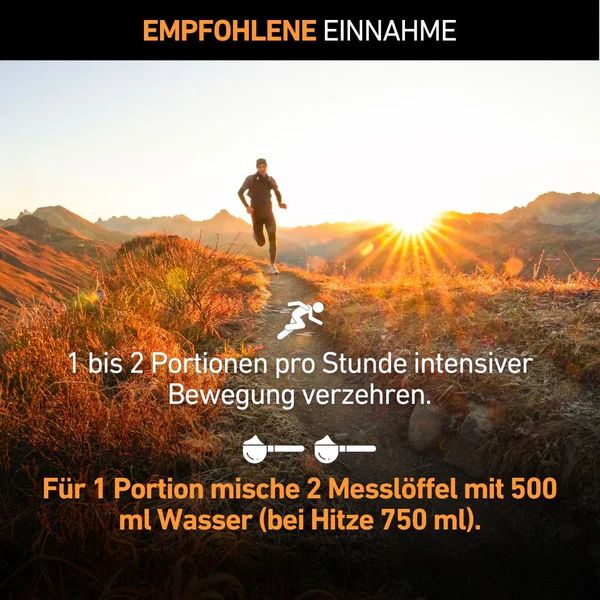 Mische 2 Messlöffel (1 Portion) mit 500 ml Wasser. Bei extremer Hitze empfehlen wir die Mischung mit 750 ml Wasser, um die Flüssigkeitsaufnahme zu erhöhen. Je nach Intensität 1 bis 2 Portionen pro Stunde konsumieren.Verzehrempfehlung: